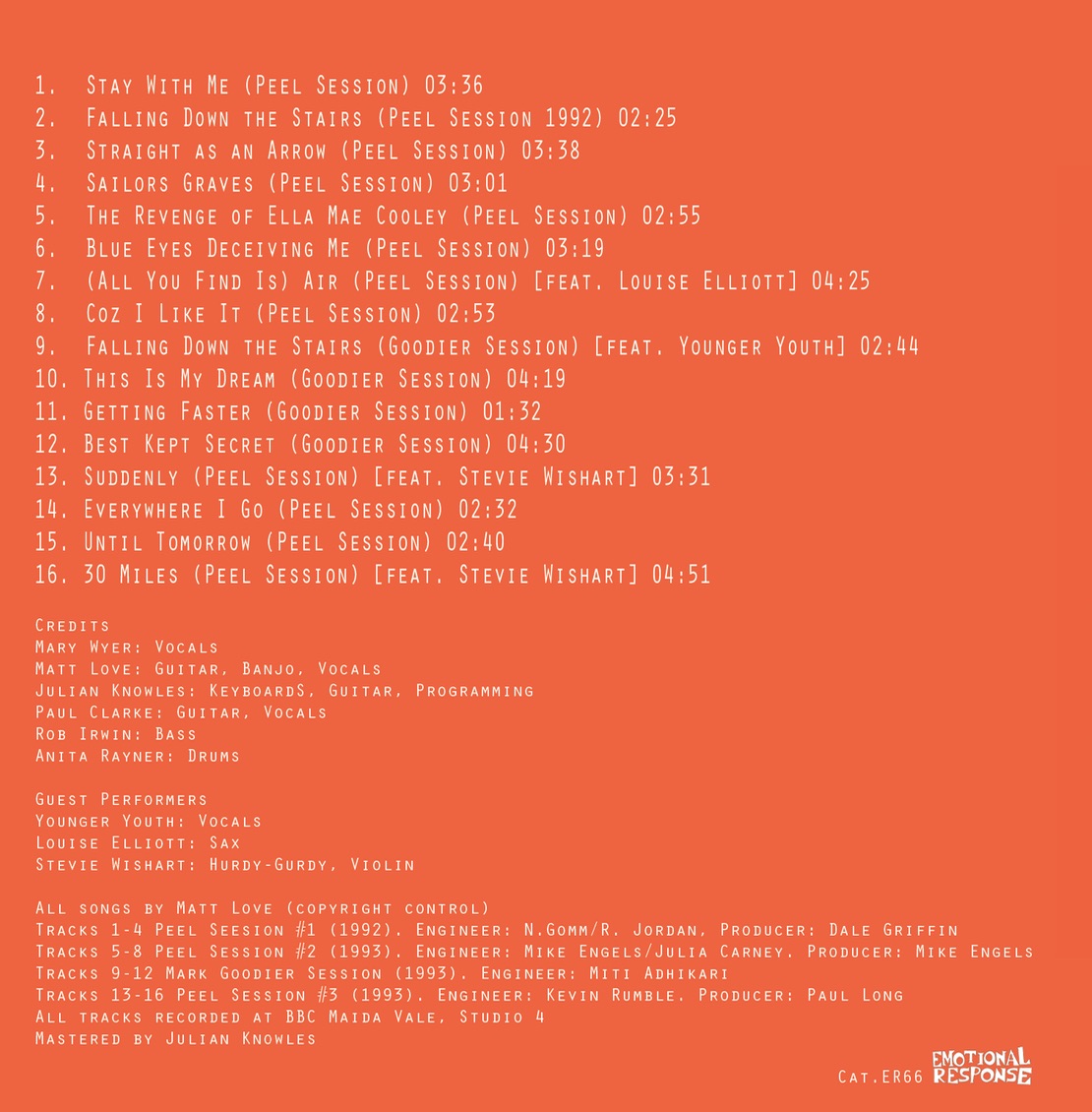 Tracks: 1. Stay With Me 2. Falling Down The Stairs [Peel Session] 3. Straight As An Arrow 4. Sailor’s Graves 5. The Revenge Of Ella Mae Cooley 6. Blue Eyes Deceiving Me 7. (All You Find Is) Air 8. Coz I Like It 9. Falling Down The Stairs [Goodier Session] 10. This Is My Dream 11. Getting Faster 12. Best Kept Secret 13. Suddenly  14. Everywhere I Go 15. Until Tomorrow 16. 30 Miles